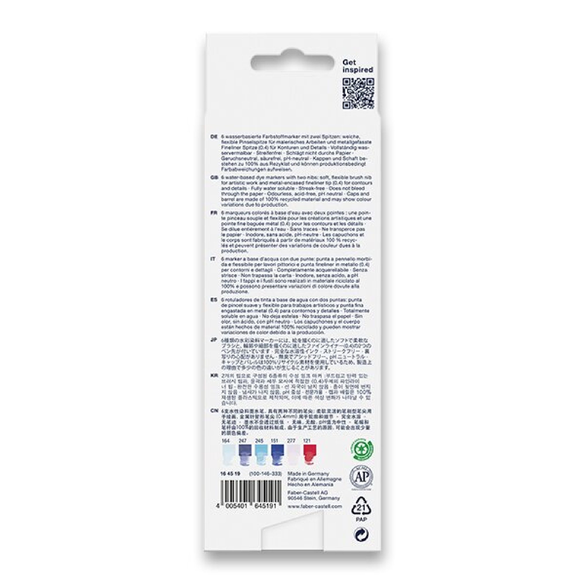 Popis:Souprava 6 barev oboustranného moderního popisovače Goldfaber Aqua Dual Marker Lettering Seaside s barvivem na bázi vody. Popisovač má měkký štětec pro uměleckou práci a tenký hrot v kovovém pouzdře pro jemné linky kontur a detailů.