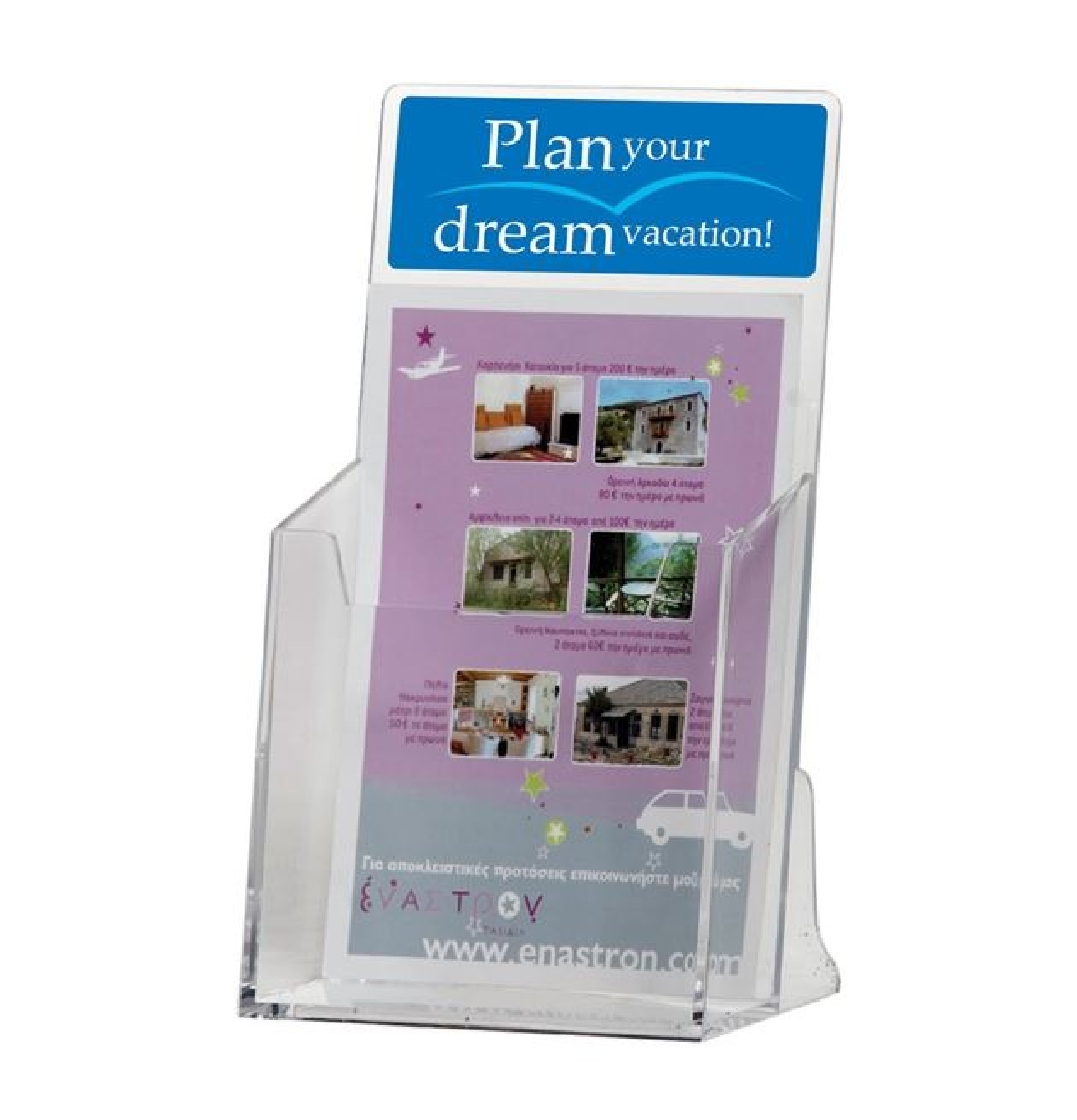 Popis:Jednoduchý stojan z průhledného akrylátu na dokumenty a katalogy s jednu přihrádkou