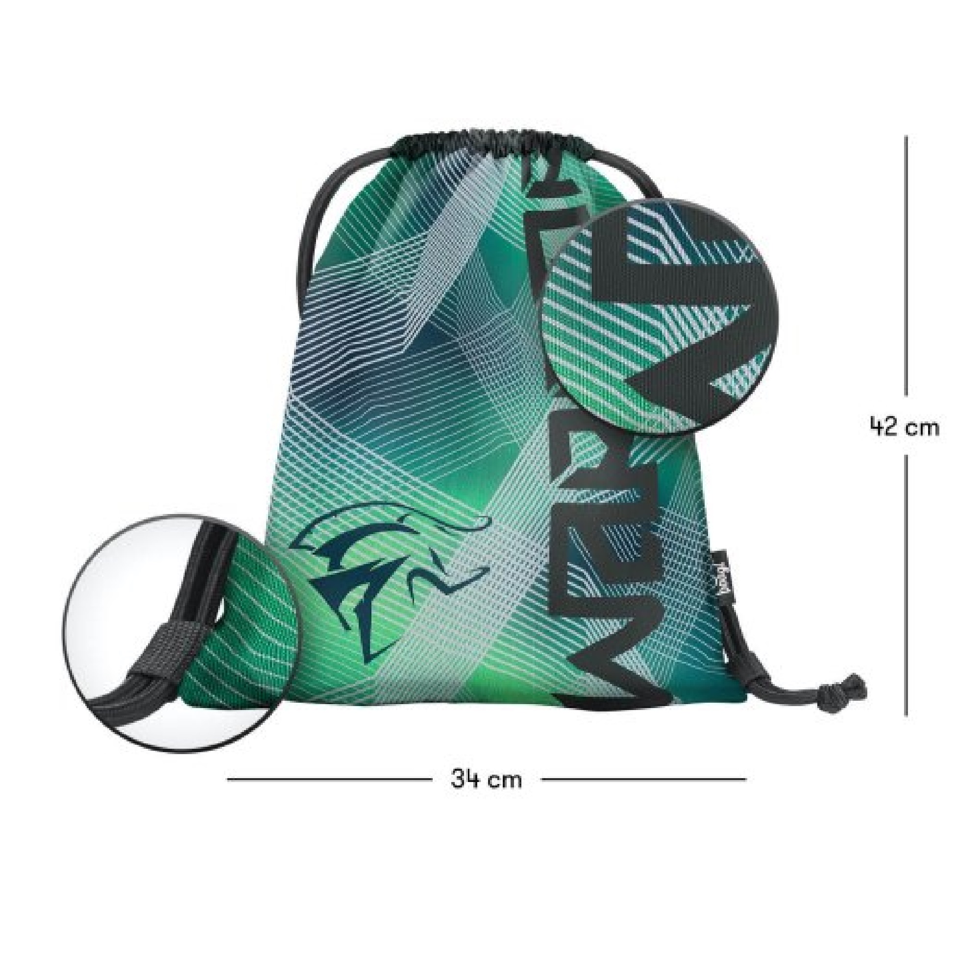 • Sáček na cvičky nebo přezůvky z pevného omyvatelného materiálu.• Zdrhování pomocí pevných tkanic, které zároveň umožňují nošení na zádech.