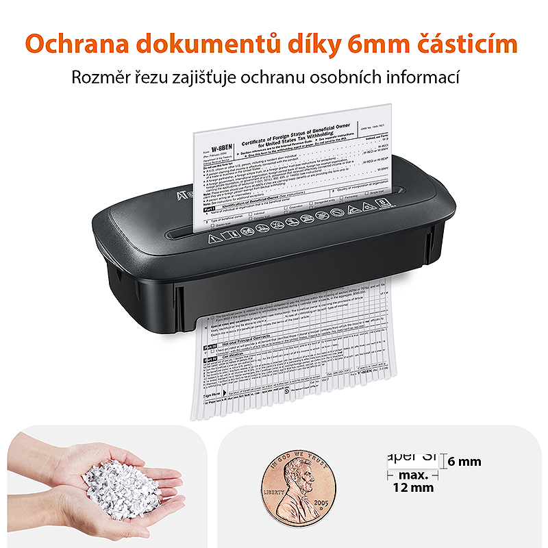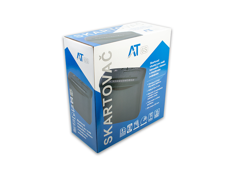 Popis:Personální skartovací stroj vhodný pro skartování dokumentů o šíři 220 mm. AT-6S je domácí skartovačka papíru, která dokáže skartovat 10 listů 70 g a 8 listů 80 g papíru velikosti A4, sponky, CD, kreditní karty, DVD, účtenky z bankomatu, účty, výplatní pásky, nevyžádanou poštu a další důležité dokumenty. Skartuje papír na proužky o šíři 6 mm, splňující bezpečnostní úroveň P1. Jeho hlučnost menší, než 70 dB. Ochrana proti přehřátí a přetížení: Design malé skartovačky papíru pro domácí kancelář s 3 minutovou nepřetržitou dobou provozu s 30 minutovým cyklem ochlazování s LED indikátorem přehřátí/přetížení. Pokud dojde k překročení tohoto limitu, varuje vás světelný indikátor a poté tepelná ochrana s automatickým vypnutím, aby byl váš stroj dobře chráněn.Ochrana proti zaseknutí: úhlový vstup pro bezpečnost s automatickým startovacím režimem a ručním zpětným chodem pro odstranění zaseknutí papíru. Pokud se papíry v řezném ústrojí zaseknou, můžete ručně přepnout tlačítko REV, abyste papíry snadno odstranili. Skartovač AT-6S je Ideální pro nenáročné použití v malých firmách nebo domácí kanceláři, Vejde se pohodlně pod stůl nebo jinou pracovní stanici pro snadný přístup po celý den.