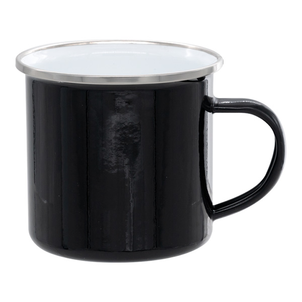 Smaltovaný celobarevný plechový hrnek 12 Oz - černý - stříbrný lem