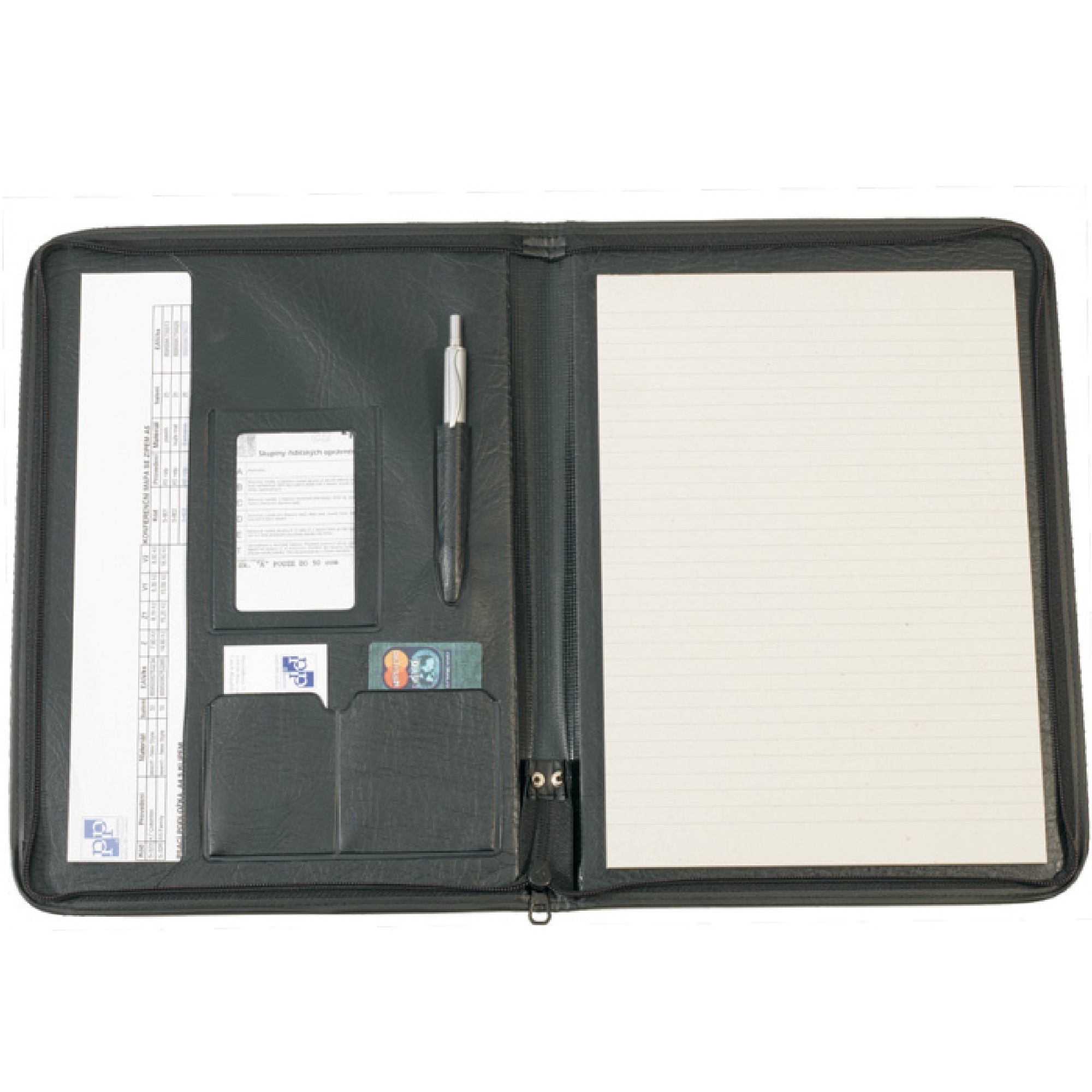 Popis:elegantní koženkové složky formátu A4, jsou uzavíratelné na zip, vybaveny poznámkovým blokem a kapsami různých rozměrů pro uložení psacích potřeb, vizitek, volných listů papírů apod., povrchová úprava složky v imitaci černé matné kůže