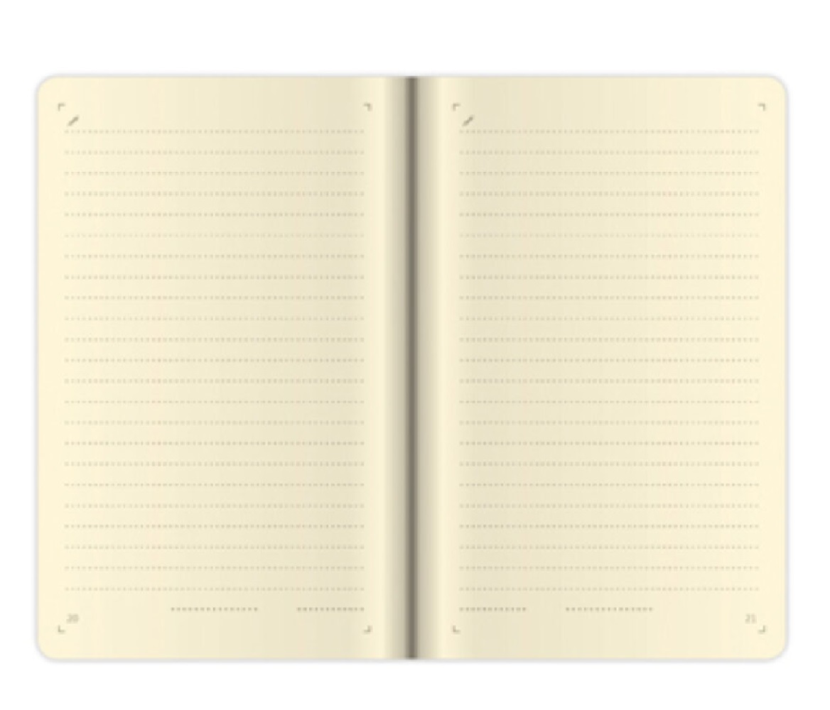 Povrch zápisníku je zhotoven z univerzálního materiálu na bázi zušlechtěného papíru, který díky své jemné struktuře získává vzhled koženky.