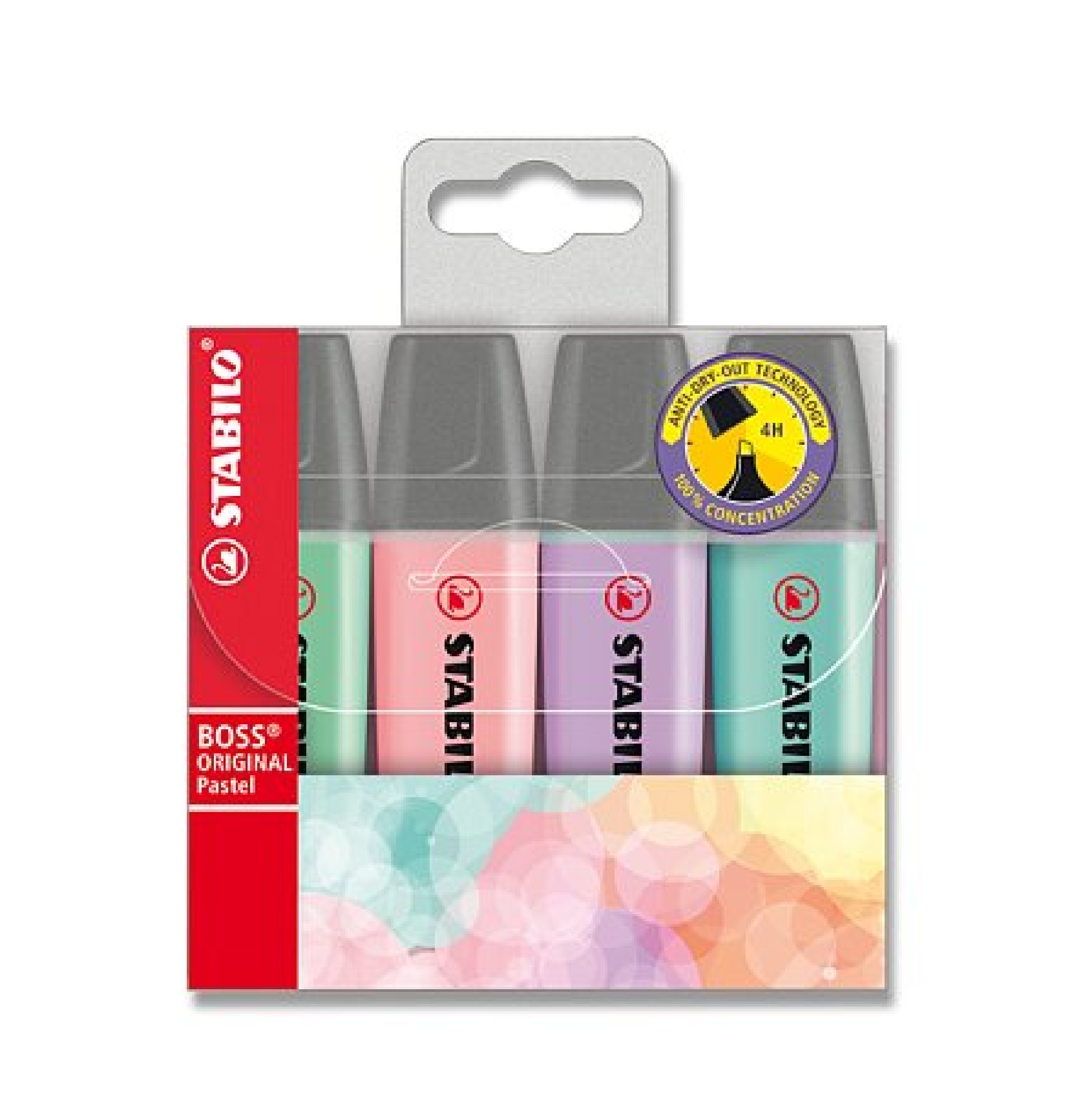 Popis:Sada 4 barev klasického zvýrazňovače Stabilo Boss v pastelových barvách. Díky technologii Anti-Dry-Out vydrží až 4 hodiny otevřený bez vyschnutí. Plastové tělo zvýrazňovače je v barvě inkoustu. Inkoust je na vodní bázi, nerozmazává text. Jedinečný zvýrazňovač, který dobře padne do ruky. Klínový hrot, šíře stopy 2 nebo 5 mm.