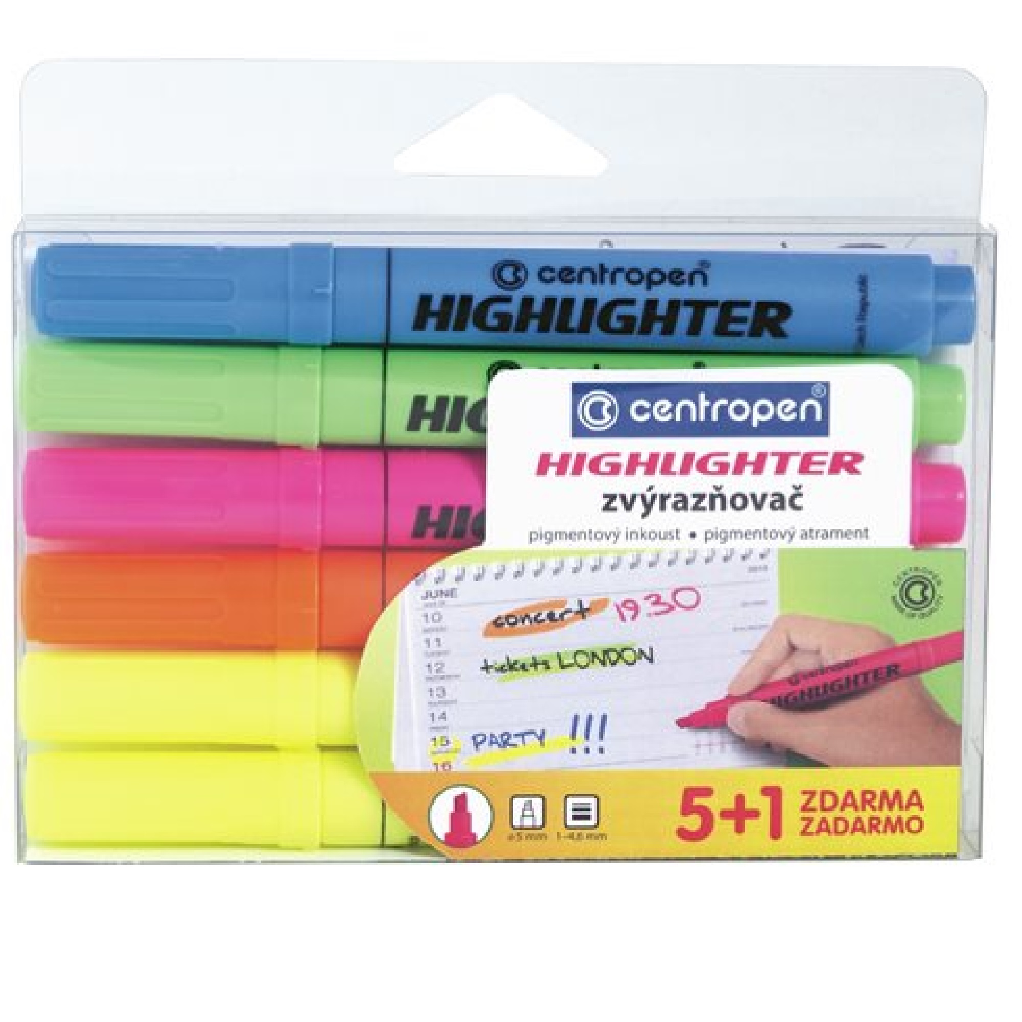 Popis:5 + 1 žlutá ZDARMA. Klínový hrot, šíře stopy 1 - 4 mm.